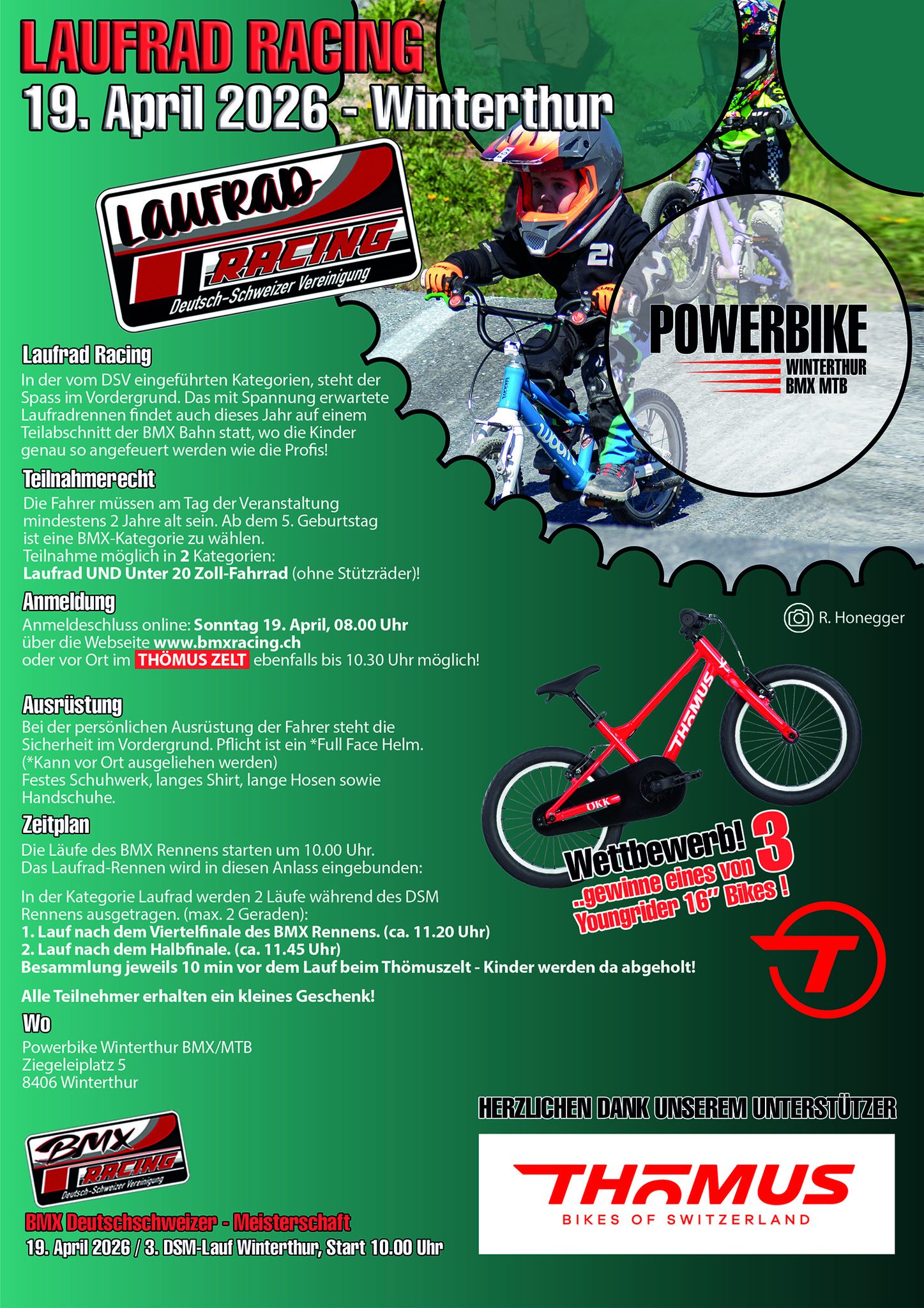 Am Sonntag, 19. April 2026, findet auf der BMX-Bahn in Winterthur ein Laufrad-Rennen für Kinder ab 2 Jahren statt. Gefahren wird auf einem Teil der offiziellen BMX-Rennstrecke - mit echter Rennatmosphäre und viel Applaus vom Publikum. Teilnehmen können Kinder mit Laufrad oder kleinen Fahrrädern (bis 20 Zoll, ohne Stützräder). Das Rennen ist Teil der Deutschschweizer BMX-Meisterschaft und bietet einen spielerischen Einstieg in den BMX-Sport.