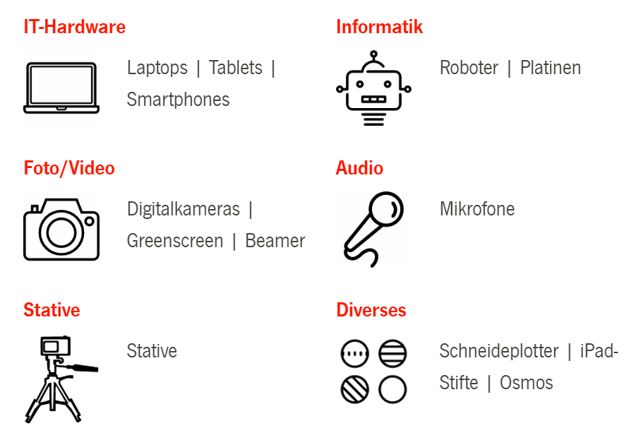 ZurückDie Ausleihe der SCHU::COM hat viele tolle Unterrichtsmaterialien im Bereich Medien und Informatik zu bieten. Ob Roboter, Platinen, Digitalkameras, Green Screen oder Mikrophone – alle können von dir für einen Zeitraum von 4 Wochen ausgeliehen werden.