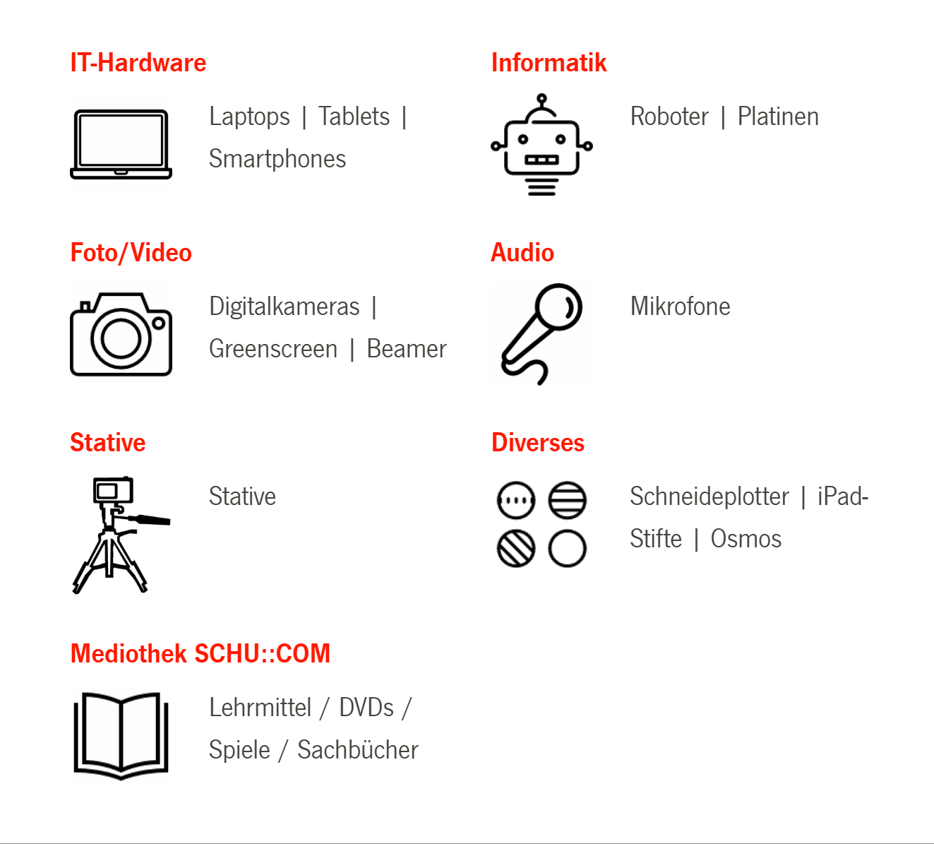 ZurückDie Ausleihe der SCHU::COM hat viele tolle Unterrichtsmaterialien im Bereich Medien und Informatik zu bieten. Ob Roboter, Platinen, Digitalkameras, Green Screen oder Mikrophone – alle können von dir für einen Zeitraum von 4 Wochen ausgeliehen werden.